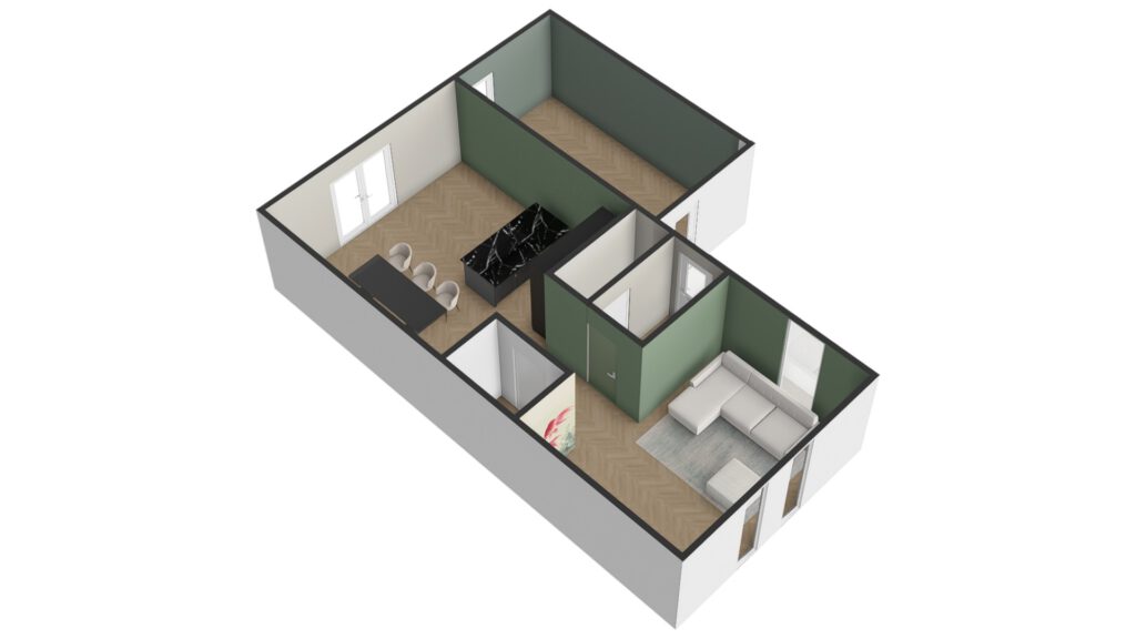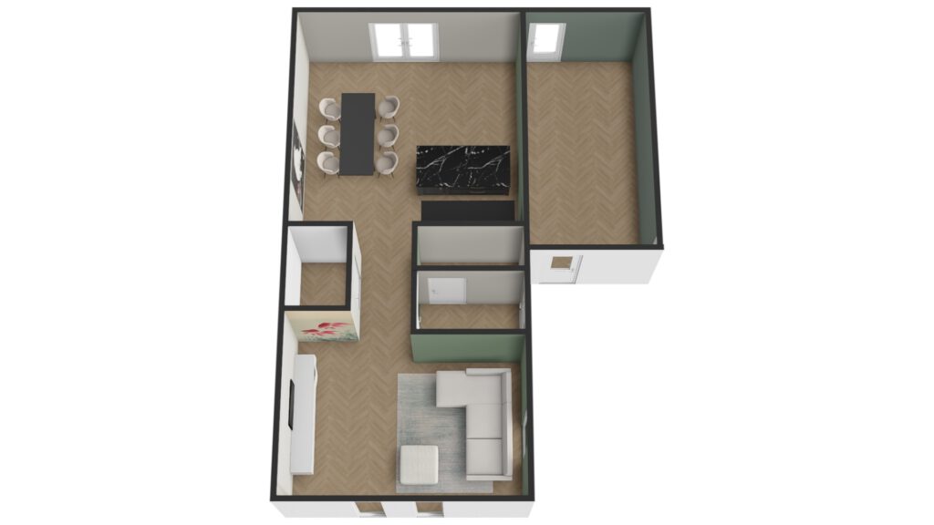 Het toevoegen van sage green was een grote wens van de bewoners. Om eenheid te creëren is deze kleur toegepast op één zijde die doorloopt van de woonkamer tot en met de keuken. Op de andere zijde is gewerkt met 2 neutrals kleuren die prachtig matchen met het groen. In de ruimte ernaast is gekozen voor een donkerder tint groen.